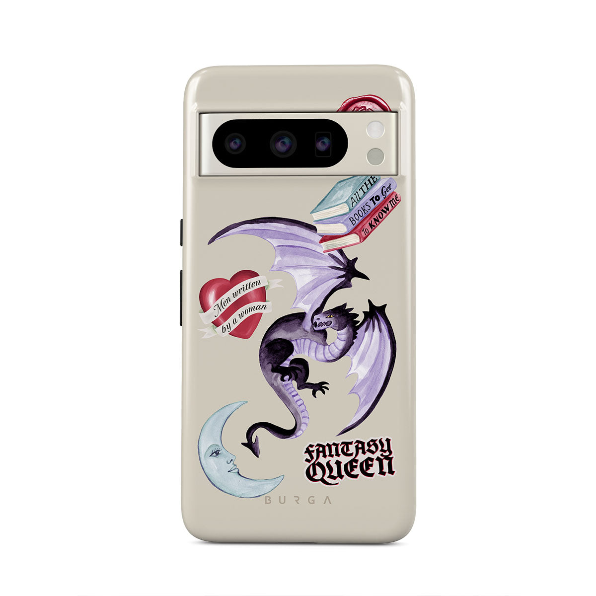 This design features: purple dragon, "Fantasy Queen" sticker, crescent moon, purple wax seal, heart with message, books