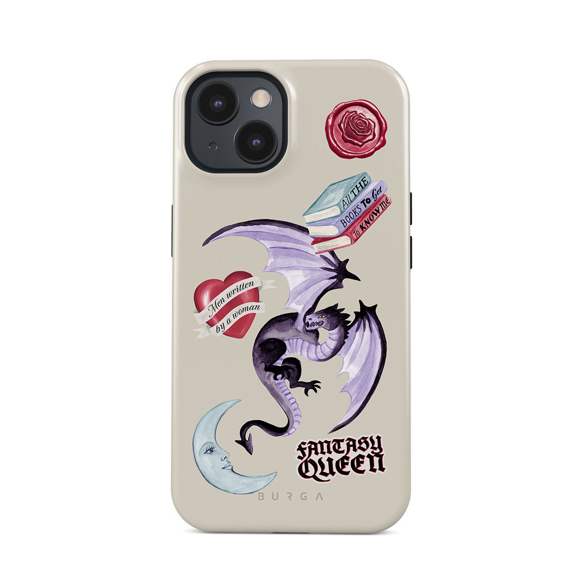 This design features: purple dragon, "Fantasy Queen" sticker, crescent moon, purple wax seal, heart with message, books