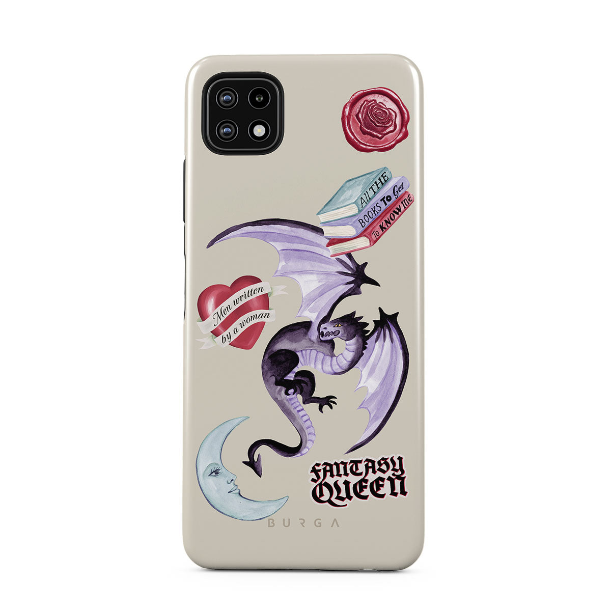 This design features: purple dragon, "Fantasy Queen" sticker, crescent moon, purple wax seal, heart with message, books