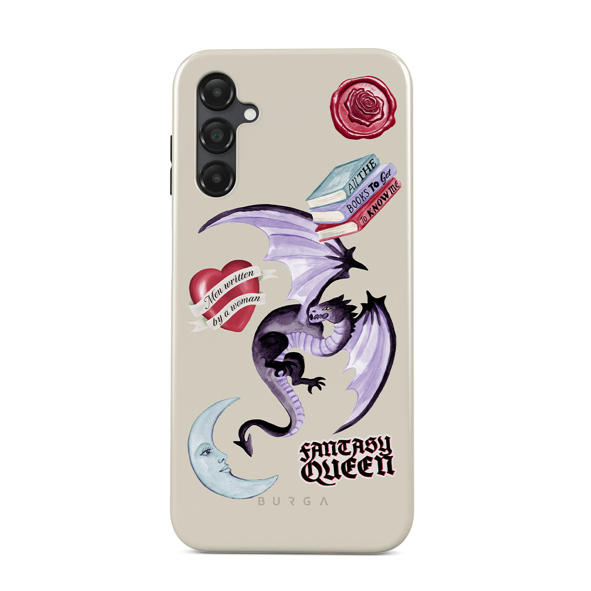 This design features: purple dragon, "Fantasy Queen" sticker, crescent moon, purple wax seal, heart with message, books