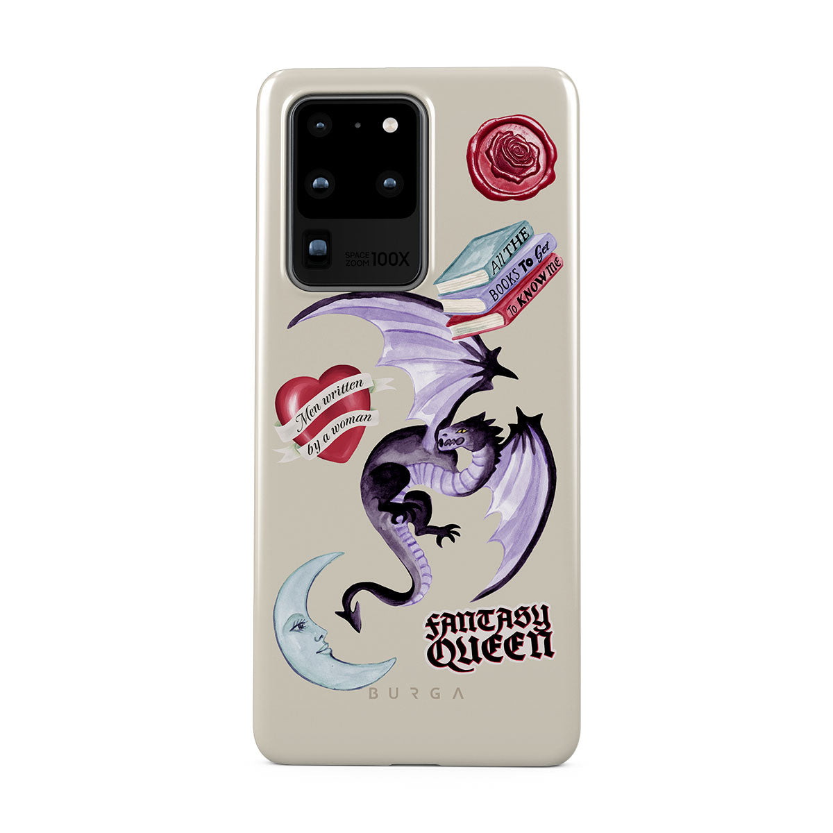 This design features: purple dragon, "Fantasy Queen" sticker, crescent moon, purple wax seal, heart with message, books