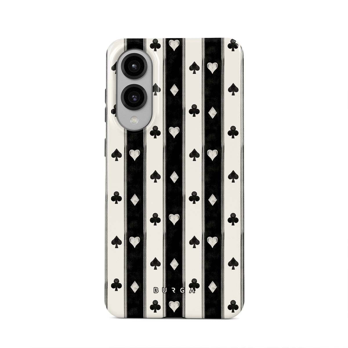 This design features: black and white stripes, hearts, playing card suits, vintage style