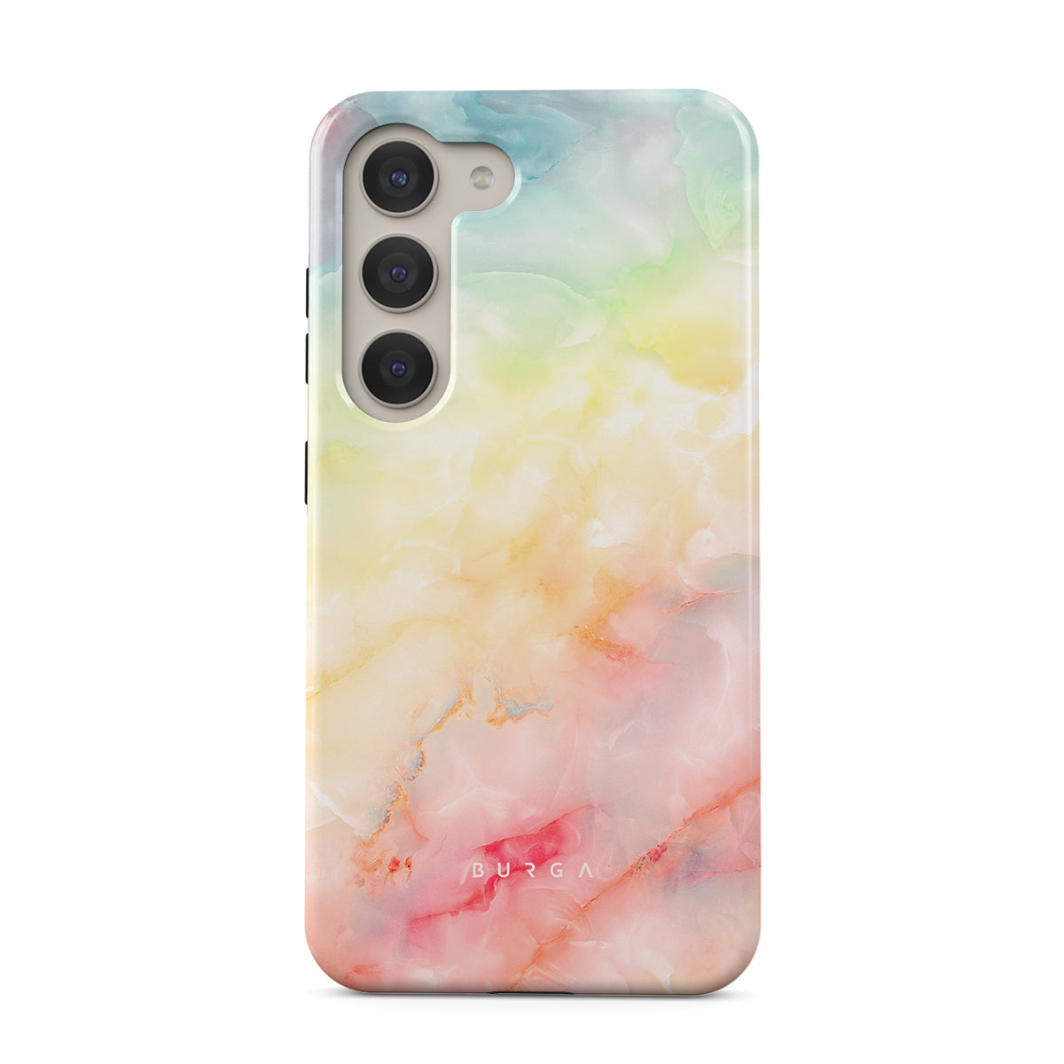 Color your world with our New Flame Samsung Galaxy S23 phone case. Inspired by the rainbow, this case is guaranteed to brighten your style. The dreamy pastel rainbow and the shockproof design of our case will keep your phone safe and sound while looking better than ever.