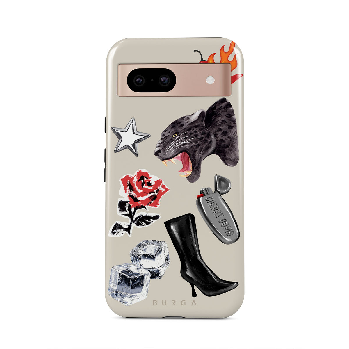 This design features: black panther, red rose, burning bell pepper, silver lighter, black knee-high boots, ice cubes, silver star
