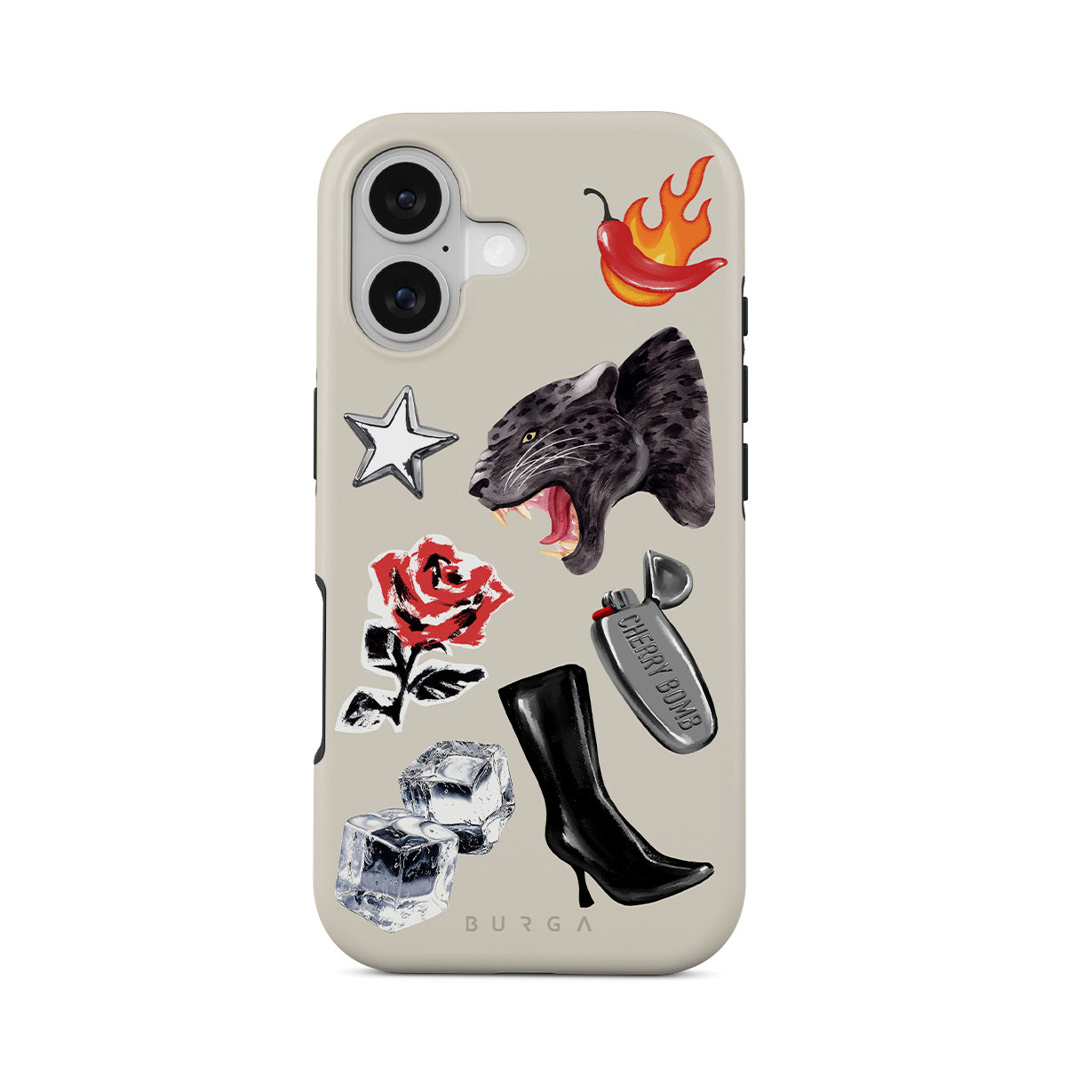 This design features: black panther, red rose, burning bell pepper, silver lighter, black knee-high boots, ice cubes, silver star