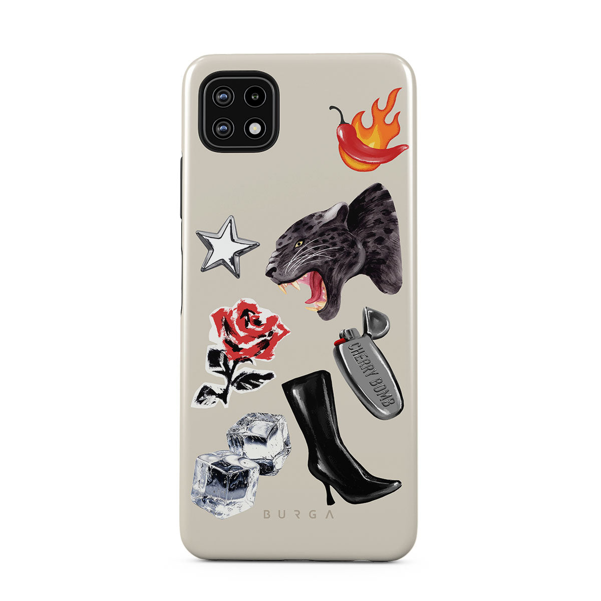 This design features: black panther, red rose, burning bell pepper, silver lighter, black knee-high boots, ice cubes, silver star