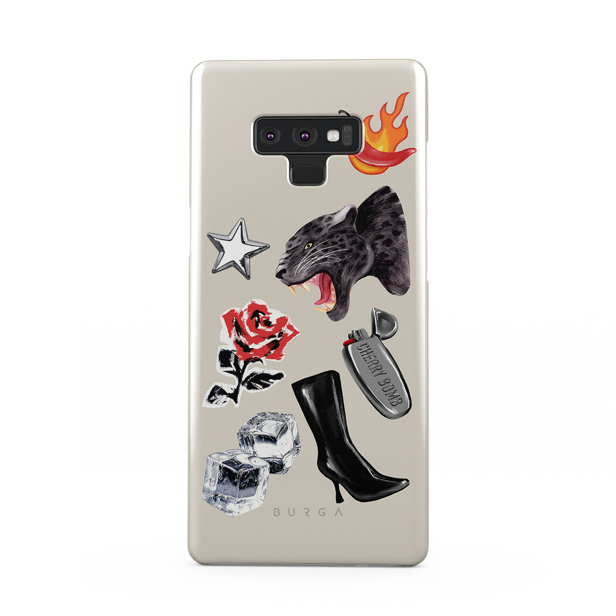 This design features: black panther, red rose, burning bell pepper, silver lighter, black knee-high boots, ice cubes, silver star