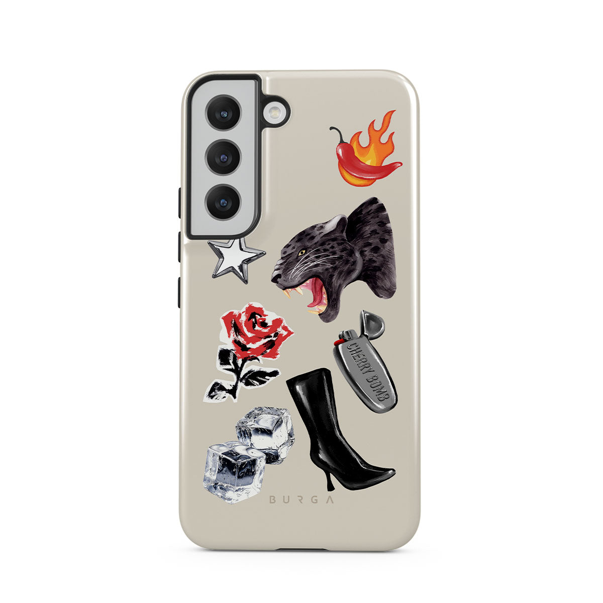 This design features: black panther, red rose, burning bell pepper, silver lighter, black knee-high boots, ice cubes, silver star