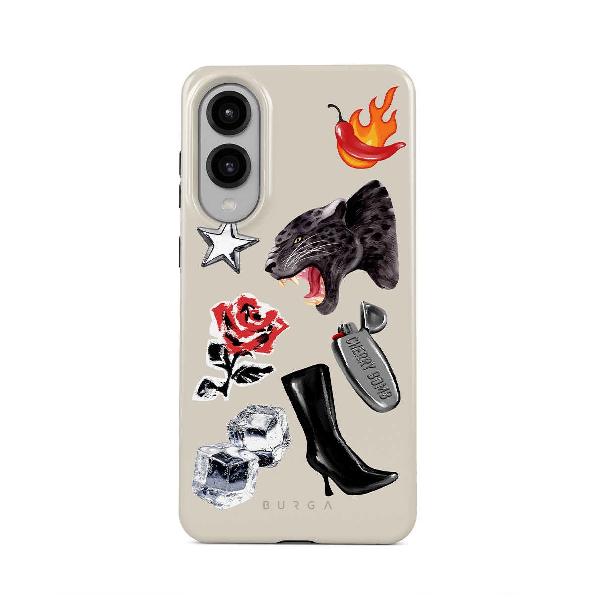 This design features: black panther, red rose, burning bell pepper, silver lighter, black knee-high boots, ice cubes, silver star