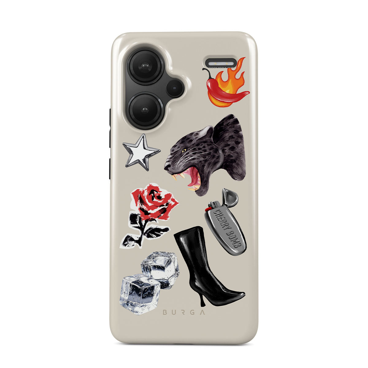 This design features: black panther, red rose, burning bell pepper, silver lighter, black knee-high boots, ice cubes, silver star