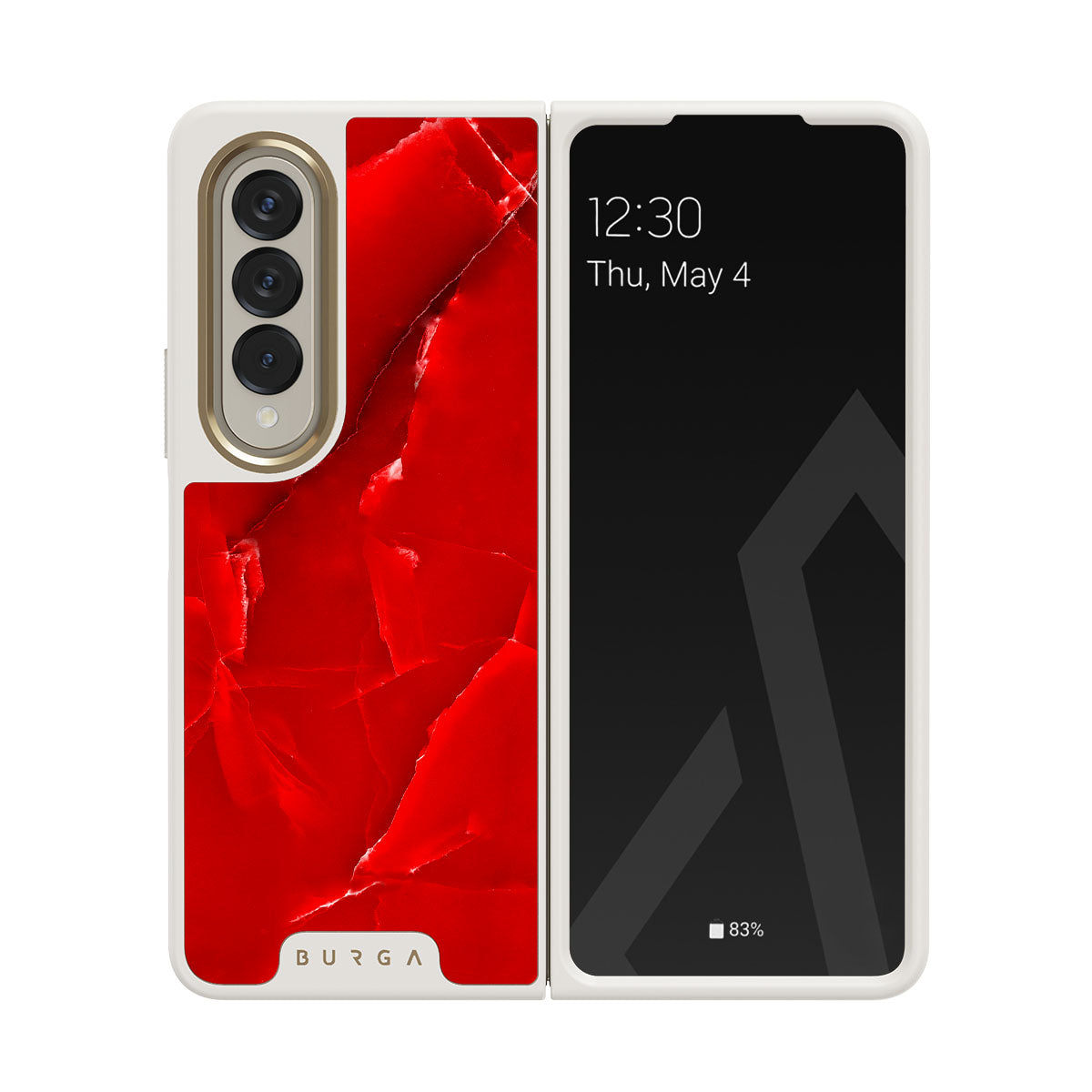 Be as bright as the red fire that cannot be tamed. The Wild Blaze Samsung Galaxy Z Fold 4 phone case features a striking bright red marble design that is guaranteed to add fierceness and a pop of color to your beloved device.