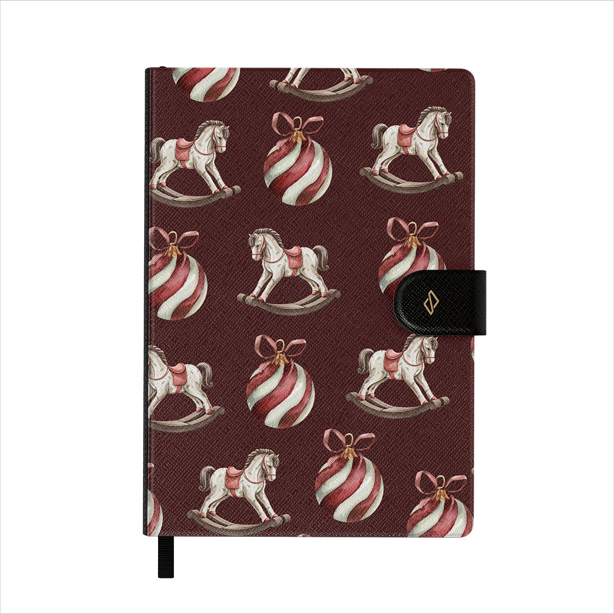 This design features: rocking horses, baubles, red, Christmas pattern.