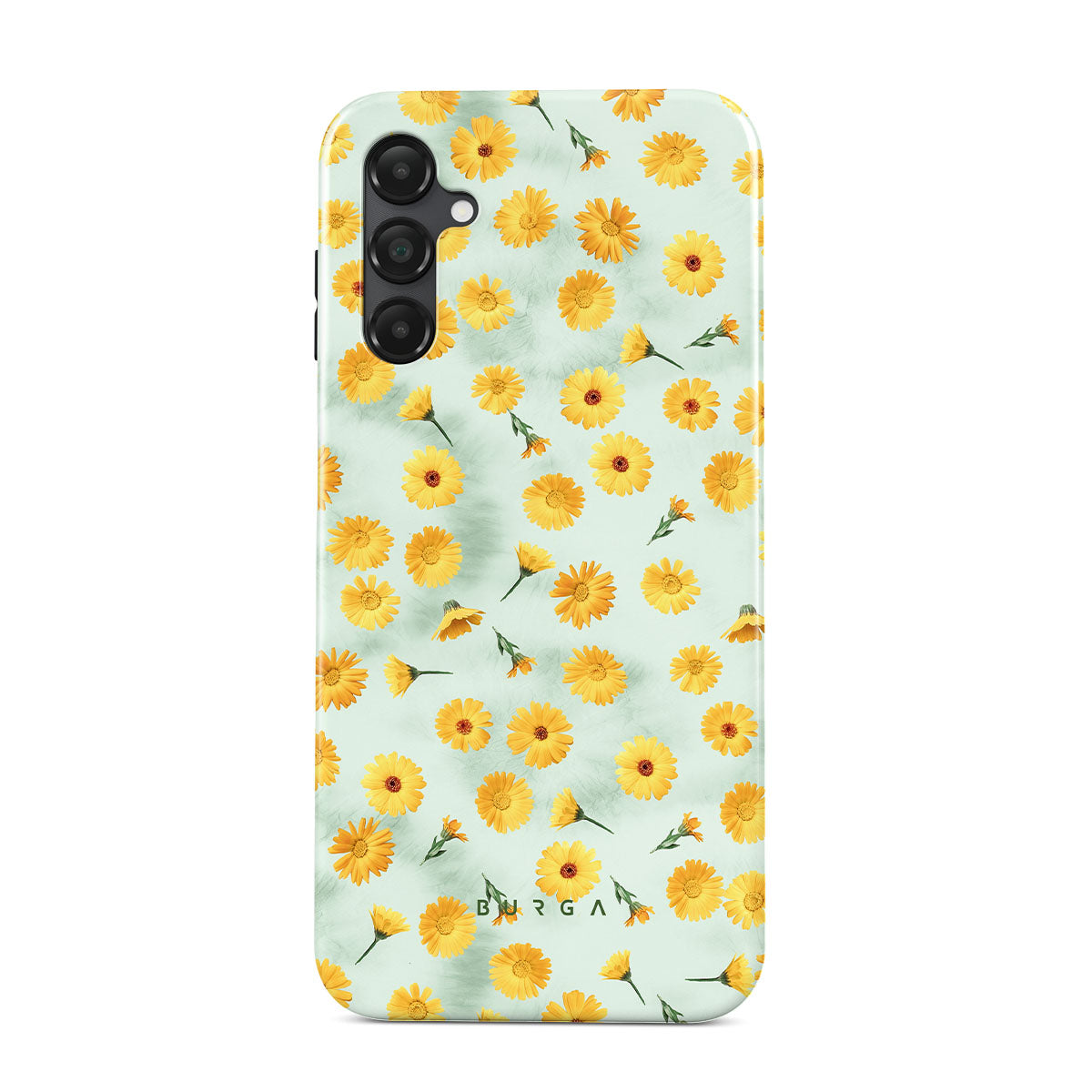 In our Sanctuary of Love Samsung Galaxy A14 5G phone case, a soft mint marble meets a glowing pattern of yellow flowers that will surely add a splash of energy to your style while protecting your phone from dangerous falls.