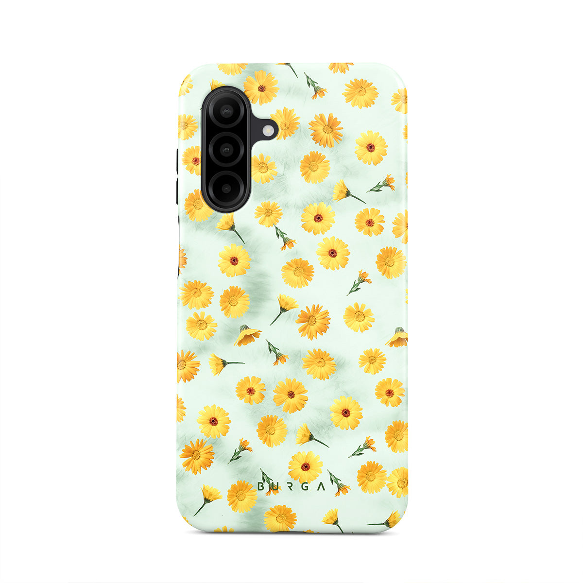 In our Sanctuary of Love Samsung Galaxy A26 5G phone case, a soft mint marble meets a glowing pattern of yellow flowers that will surely add a splash of energy to your style while protecting your phone from dangerous falls.