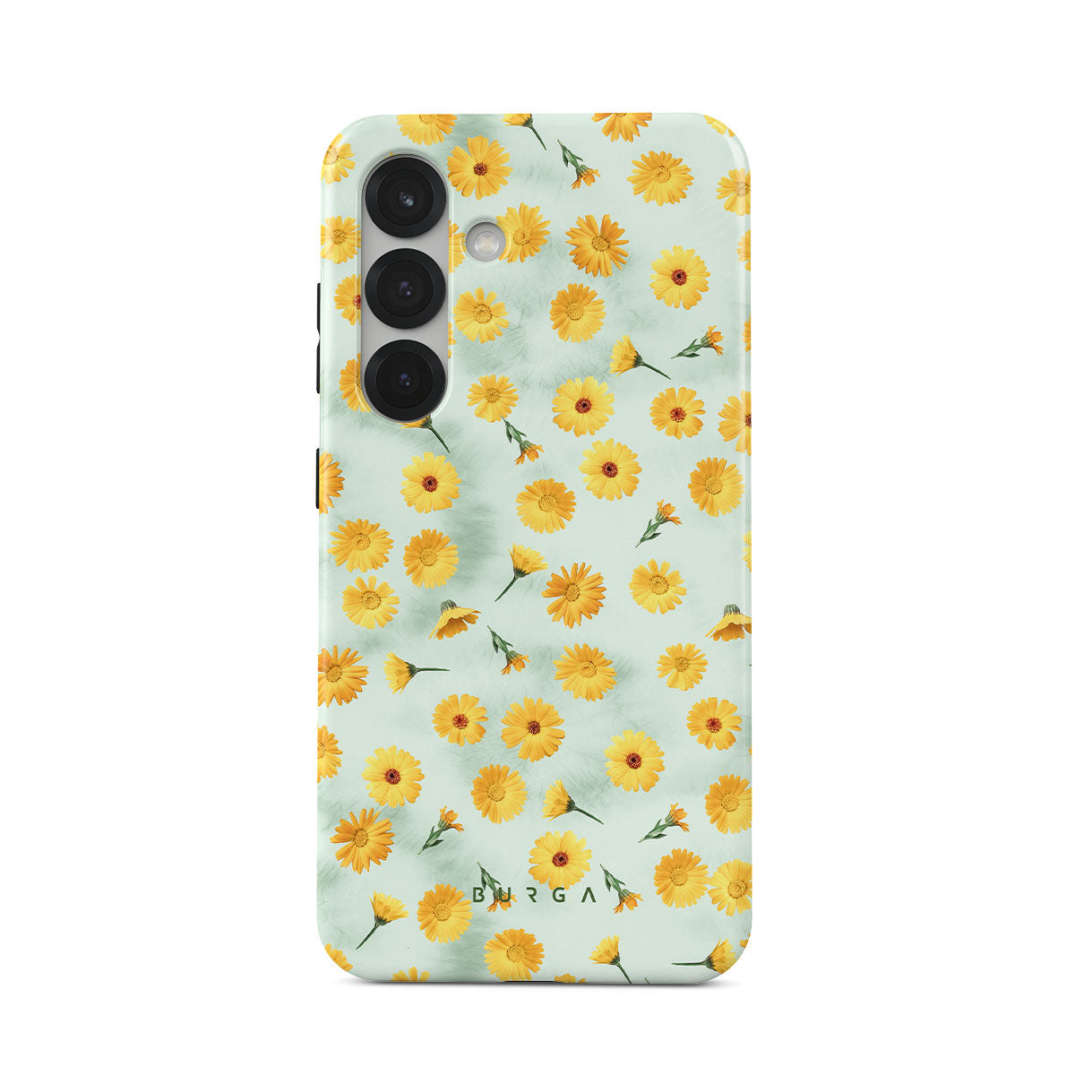 In our Sanctuary of Love Samsung Galaxy S25 Plus phone case, a soft mint marble meets a glowing pattern of yellow flowers that will surely add a splash of energy to your style while protecting your phone from dangerous falls.