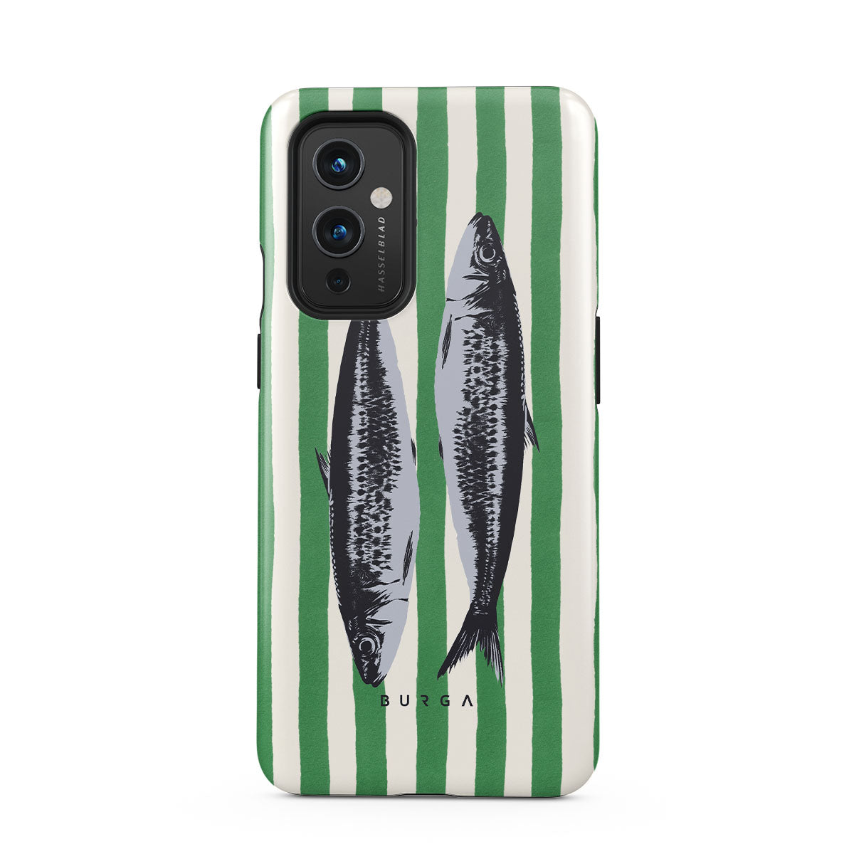 This design features: Sardines, green stripes, ocean motifs