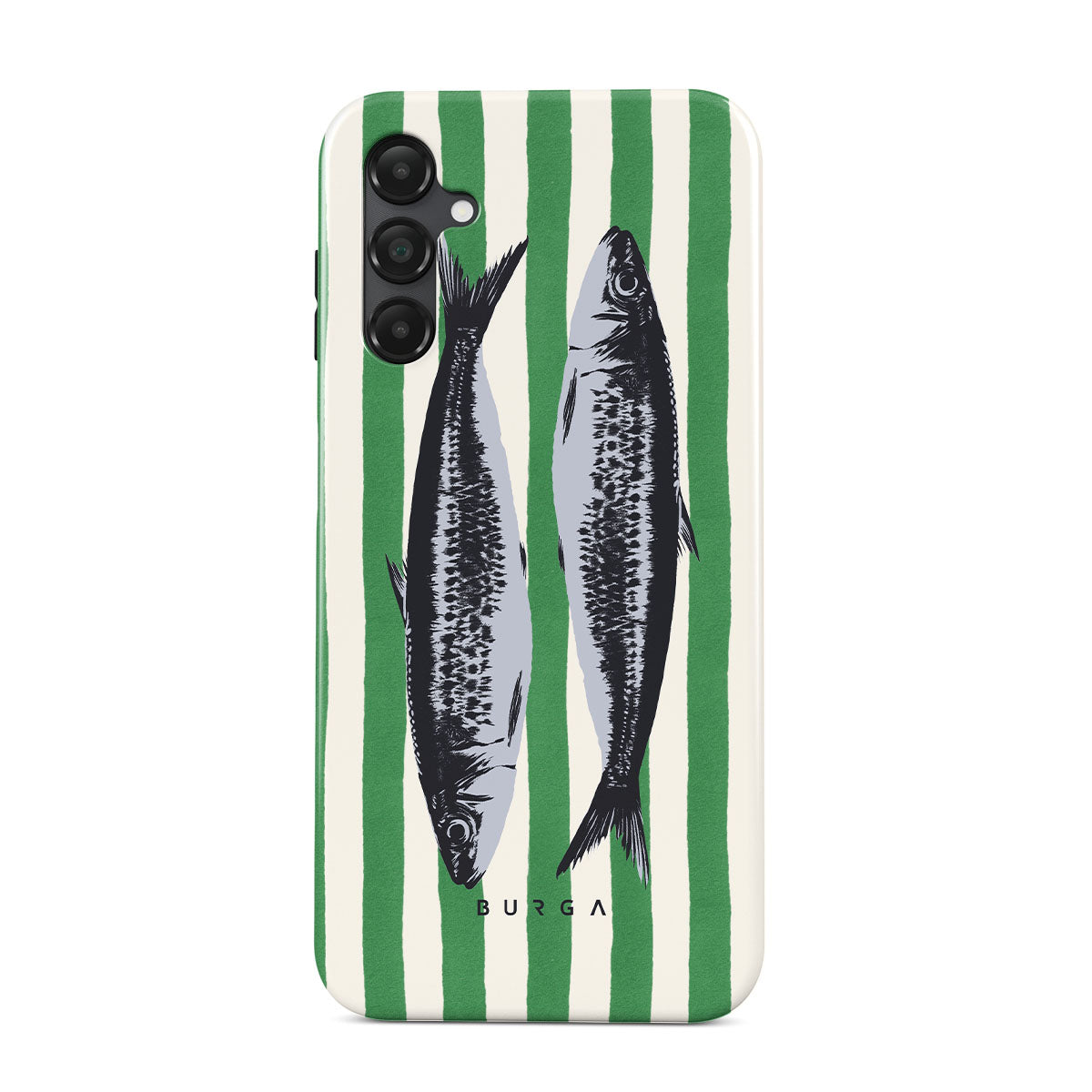 This design features: Sardines, green stripes, ocean motifs