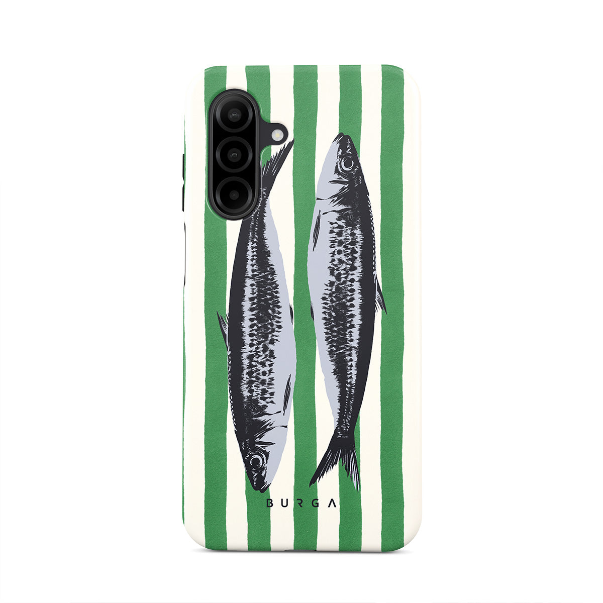 This design features: Sardines, green stripes, ocean motifs