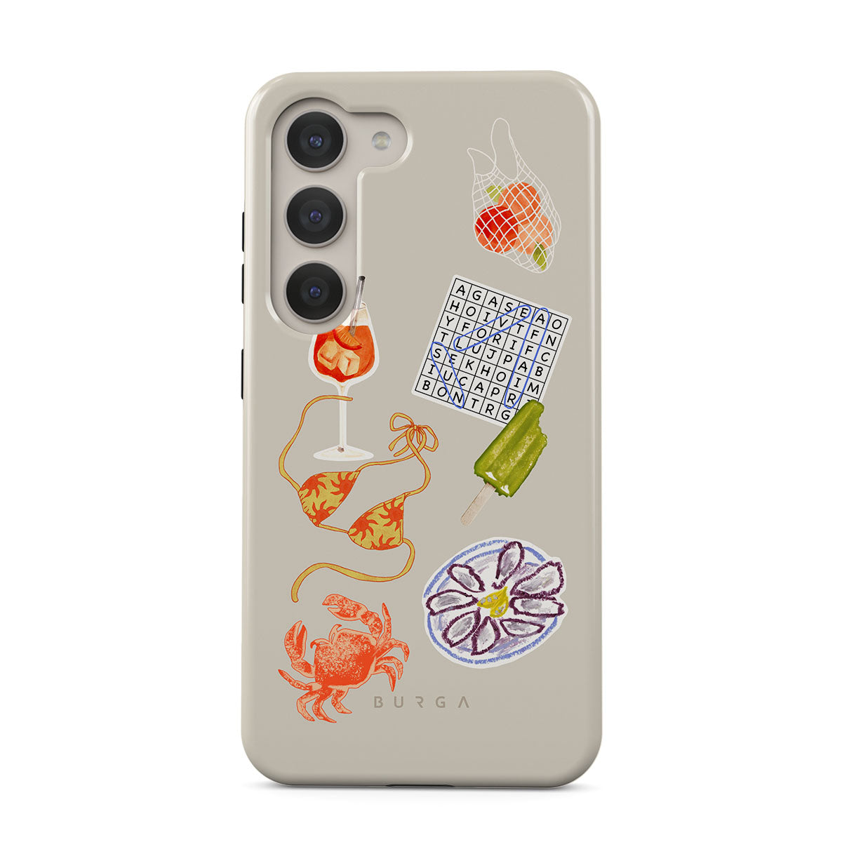 This design features: crab, oysters plate, popsicle, crossword puzzle, spritz cocktail, bikini top, fruits