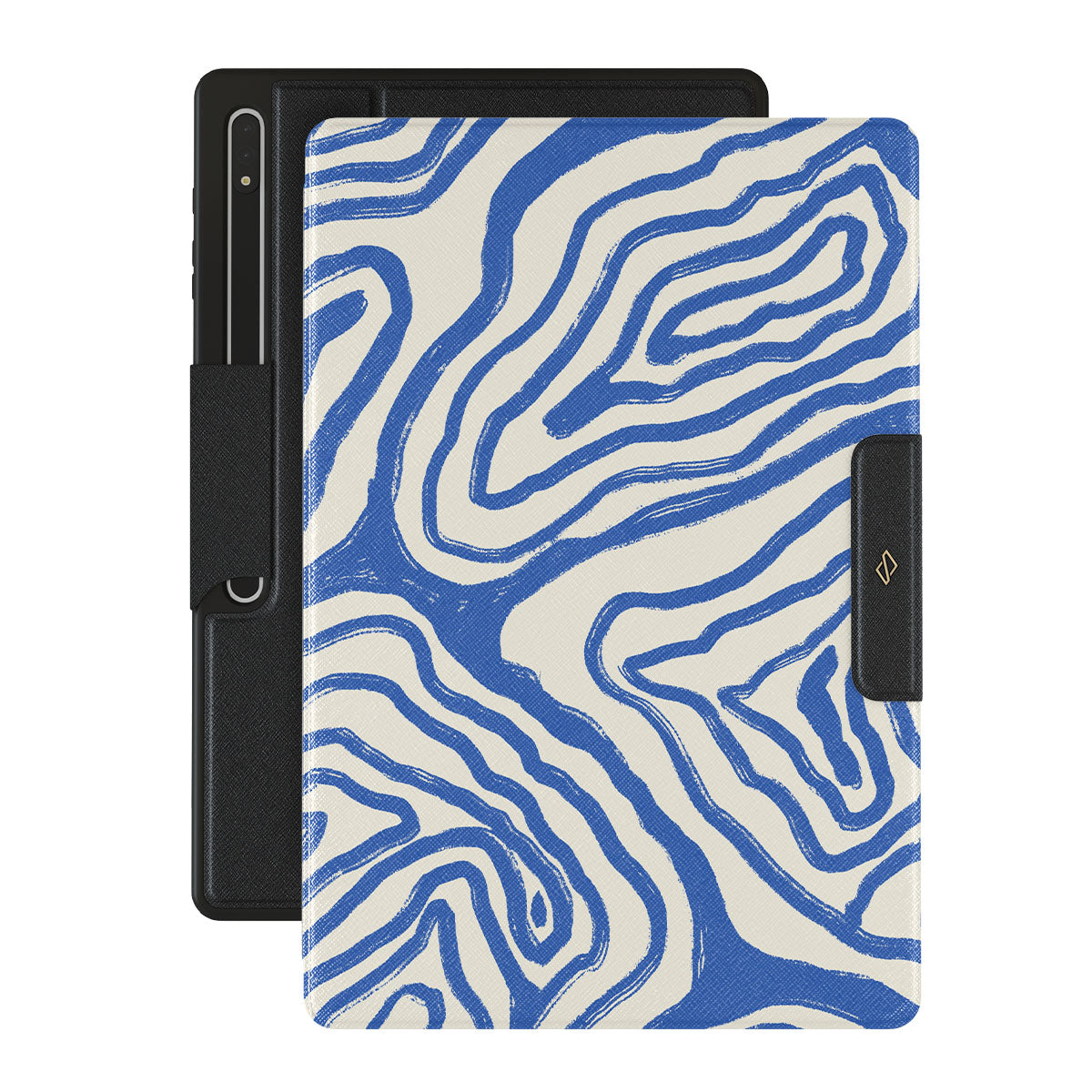 The Seven Seas Samsung Galaxy Tab S8 Ultra folio case is a perfect accessory for those who love the ocean and seek to carry a piece of its magic with them. The delicate swirls that dance in shades of oceanic blue inspire a sense of adventure. At the same time, they invite us to pause and appreciate the fluidity and serenity of the sea.