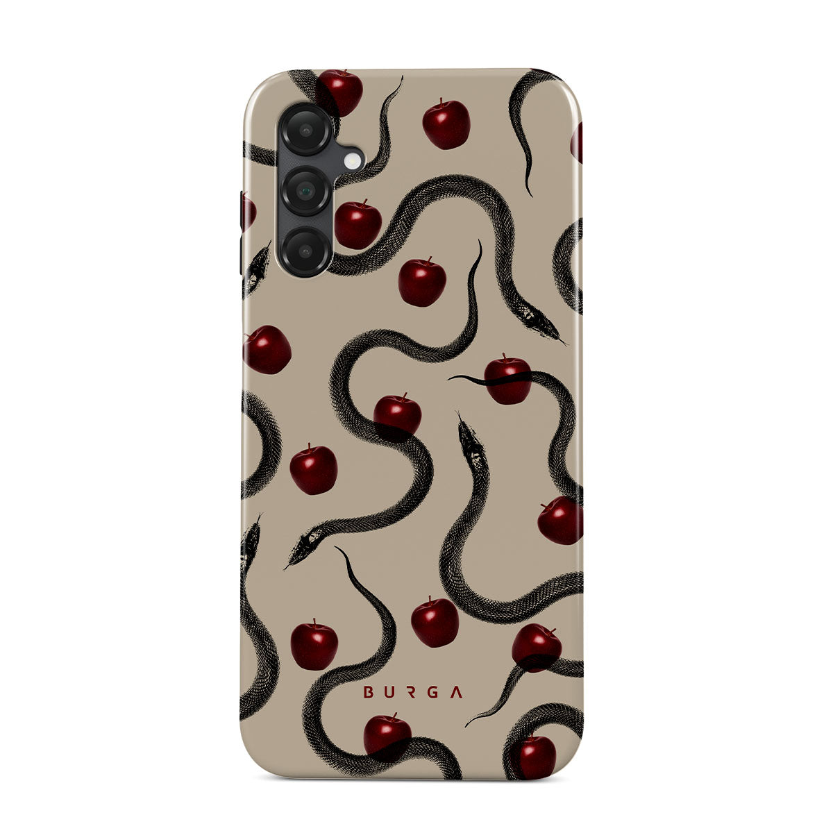 This design features: glossy red apples, coiled serpents, beige tones