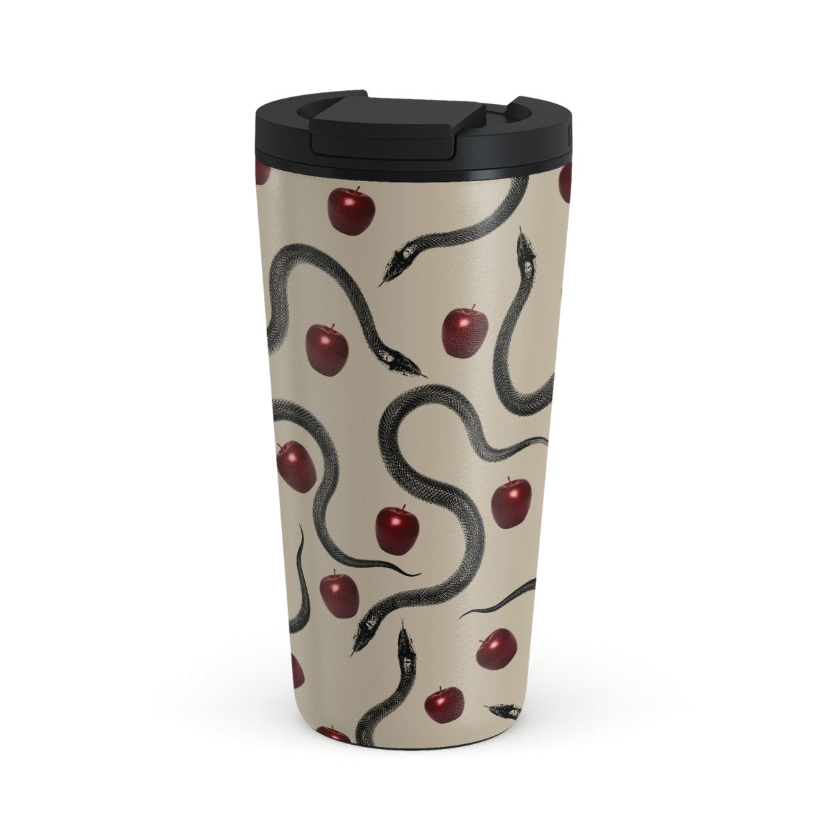 This design features: glossy red apples, coiled serpents, beige tones
