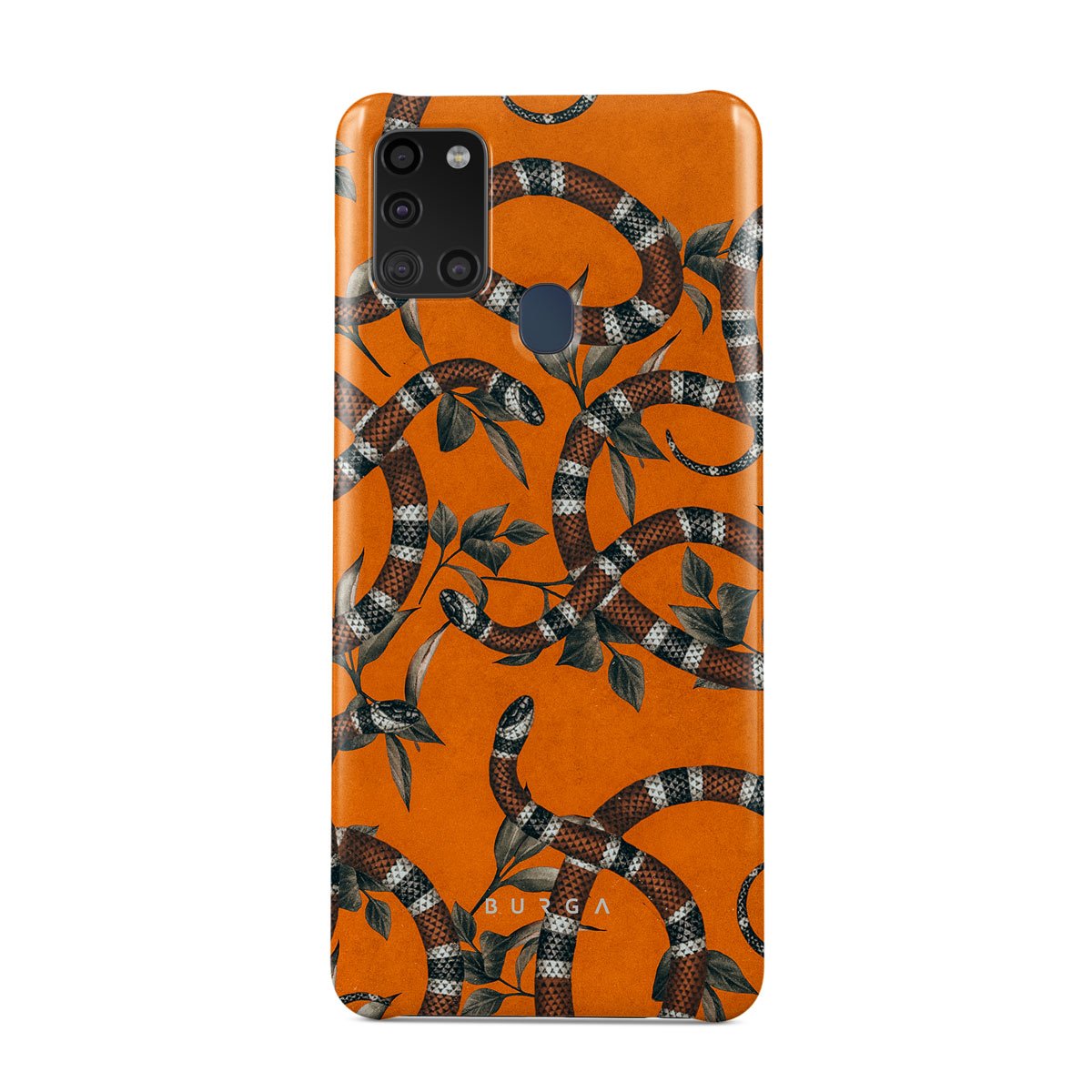 Take a bit of fierceness with yourself with our bright orange and dangerously beautiful Samsung Galaxy A21s 4G phone case with a snake pattern. This case is real eye candy for fashion lovers and just as needed for those who strive to keep their phones protected.