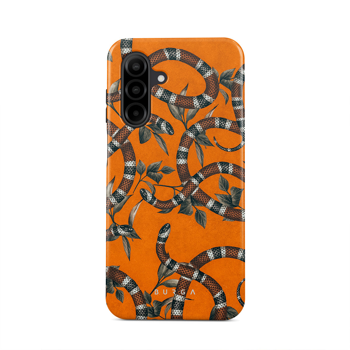 Take a bit of fierceness with yourself with our bright orange and dangerously beautiful Samsung Galaxy A26 5G phone case with a snake pattern. This case is real eye candy for fashion lovers and just as needed for those who strive to keep their phones protected.