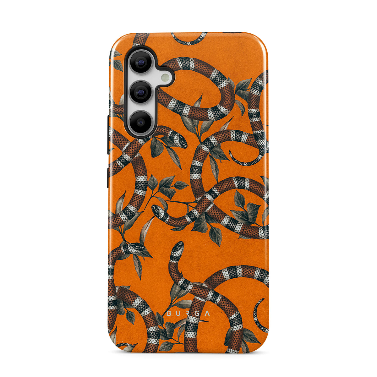 Take a bit of fierceness with yourself with our bright orange and dangerously beautiful Samsung Galaxy A51 phone case with a snake pattern. This case is real eye candy for fashion lovers and just as needed for those who strive to keep their phones protected.