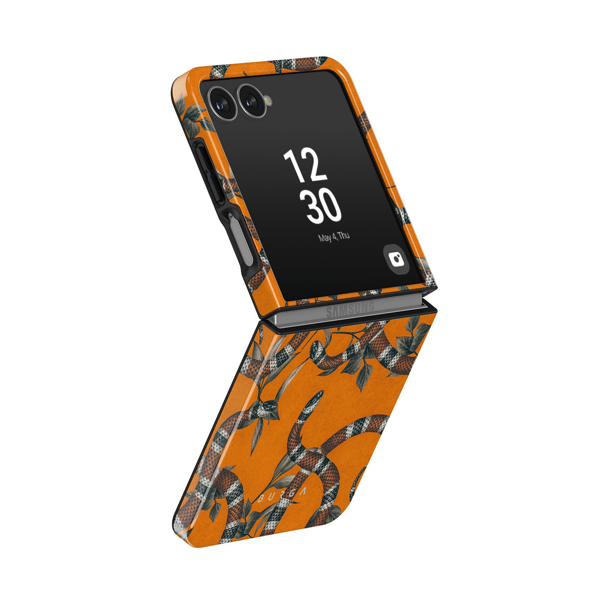 Take a bit of fierceness with yourself with our bright orange and dangerously beautiful Samsung Galaxy Z Flip 7 phone case with a snake pattern. This case is real eye candy for fashion lovers and just as needed for those who strive to keep their phones protected.