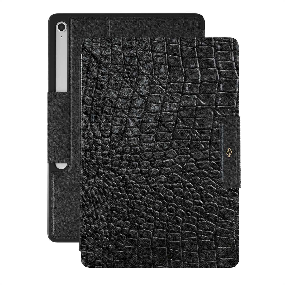 Our Reaper's Touch Samsung Galaxy Tab S10+ FE folio case cover features a classic snakeskin design in dark black. The dangerous animal print will add confidence and a touch of luxury to your style while transforming your Galaxy Tab into a fashion accessory.
