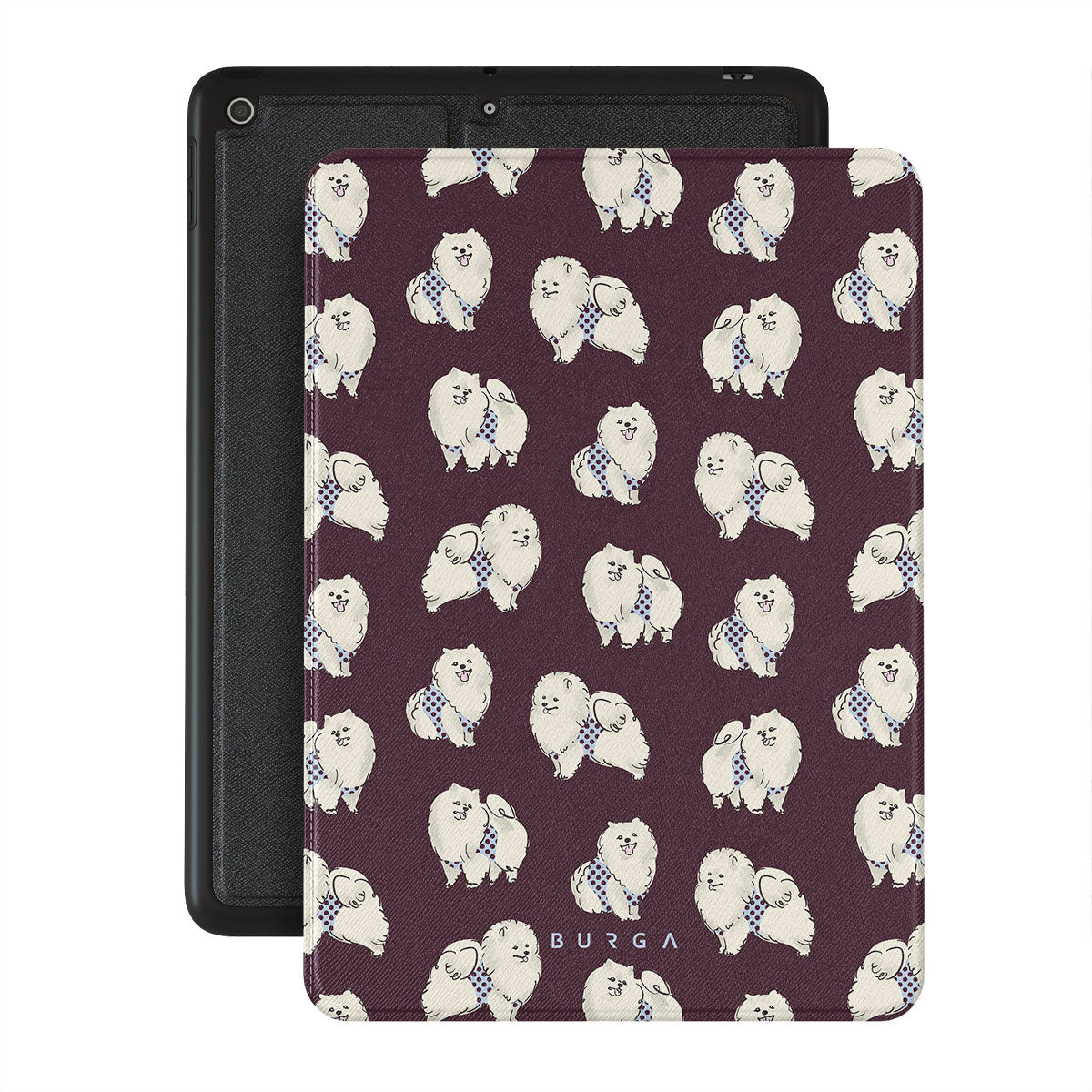 This design features: white fluffy dogs on a deep burgundy background, poodles, pets.