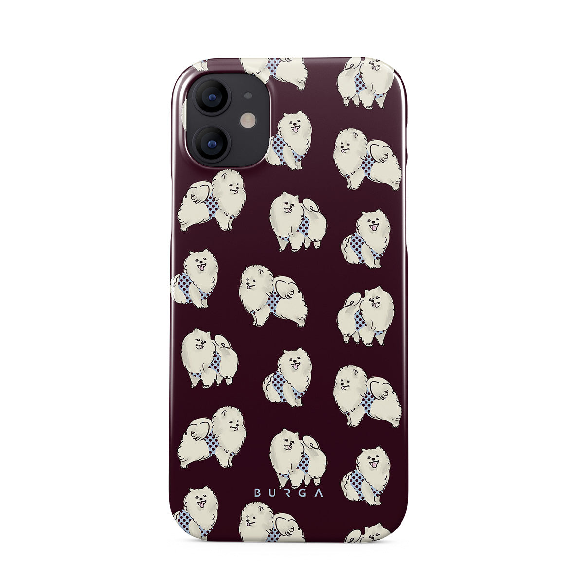This design features: white fluffy dogs on a deep burgundy background, poodles, pets.