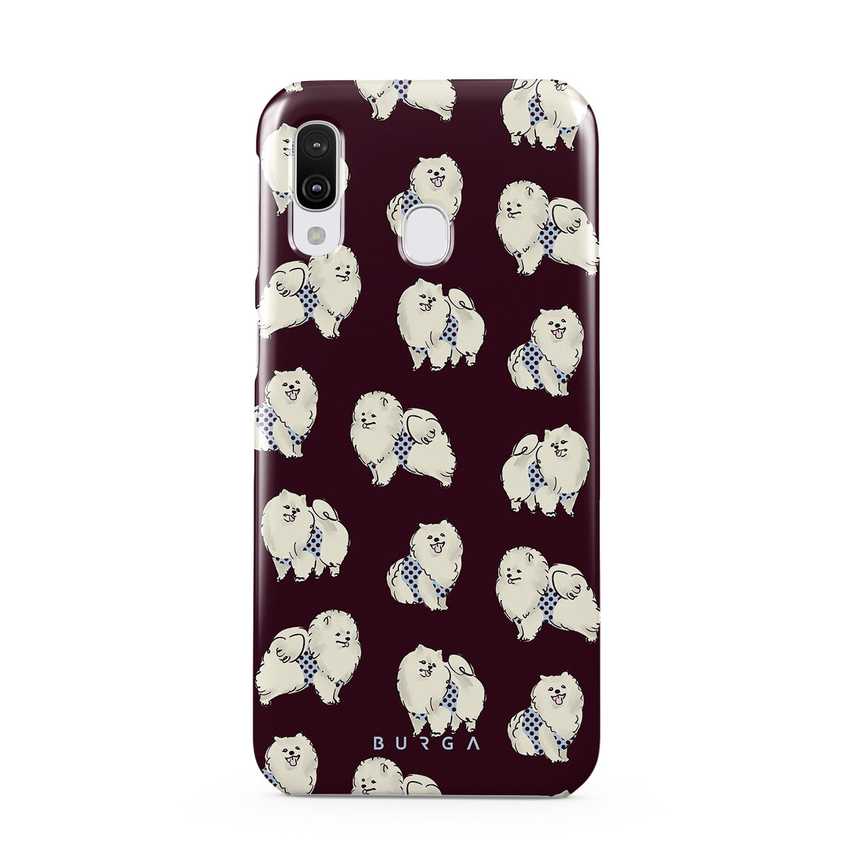 This design features: white fluffy dogs on a deep burgundy background, poodles, pets.