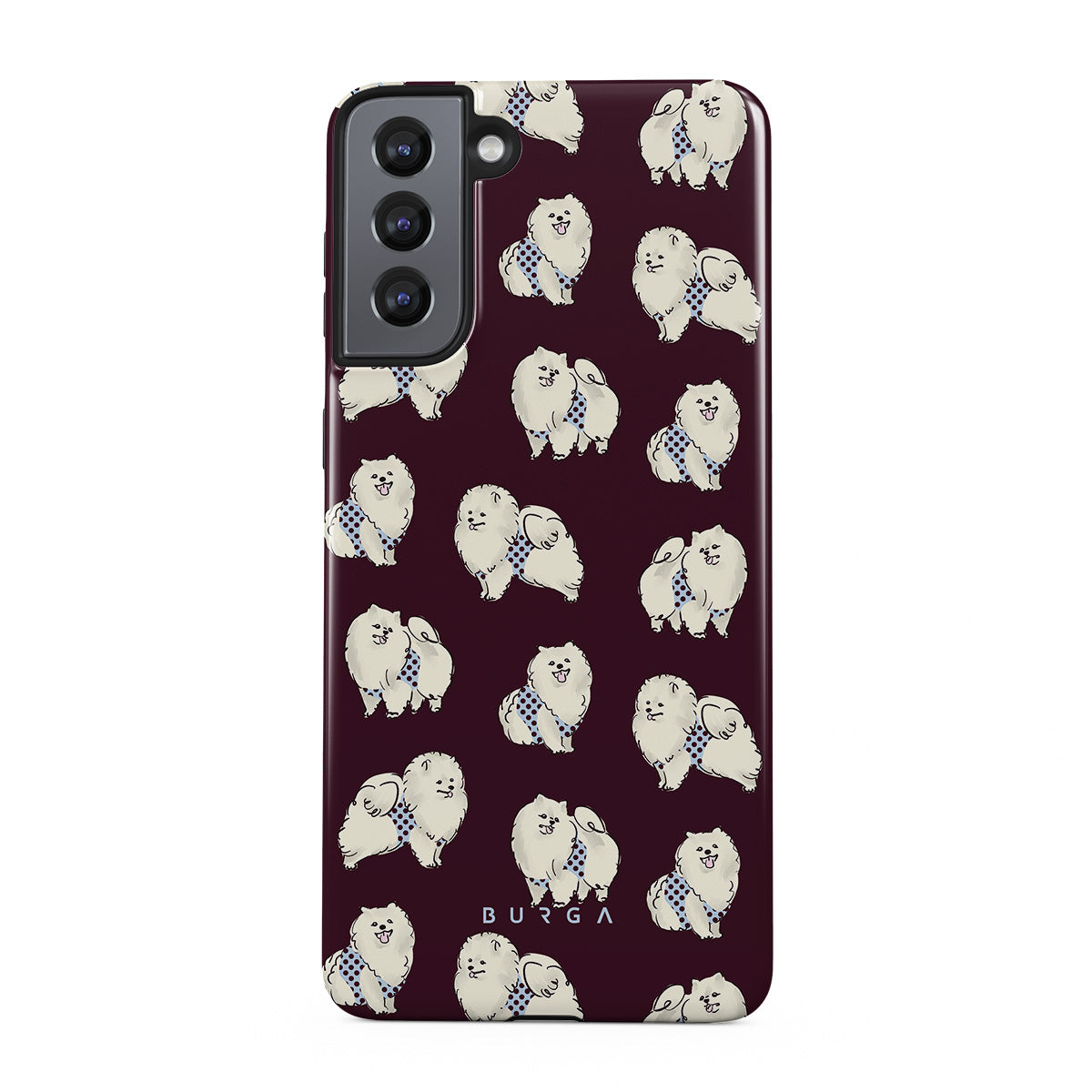 This design features: white fluffy dogs on a deep burgundy background, poodles, pets.