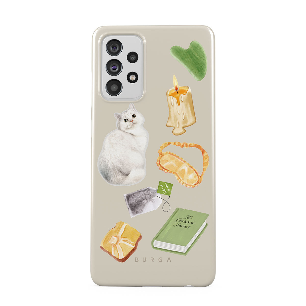 This design features: white cat, green book, candle, Gua Sha bar, sleeping mask, tea bag, yellow crystal