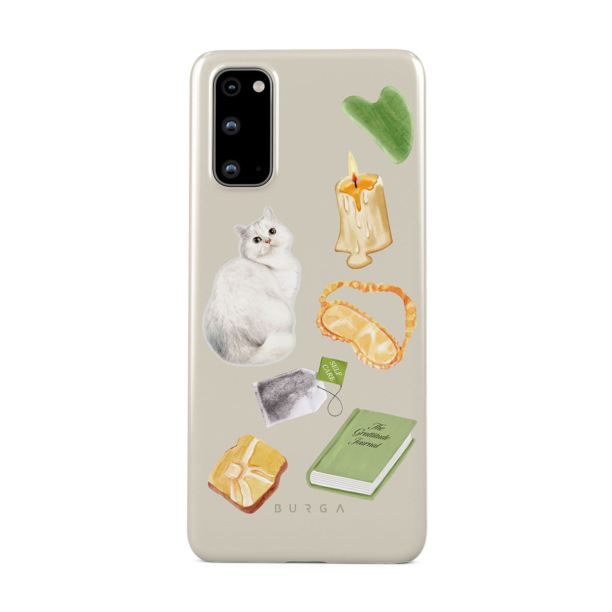 This design features: white cat, green book, candle, Gua Sha bar, sleeping mask, tea bag, yellow crystal