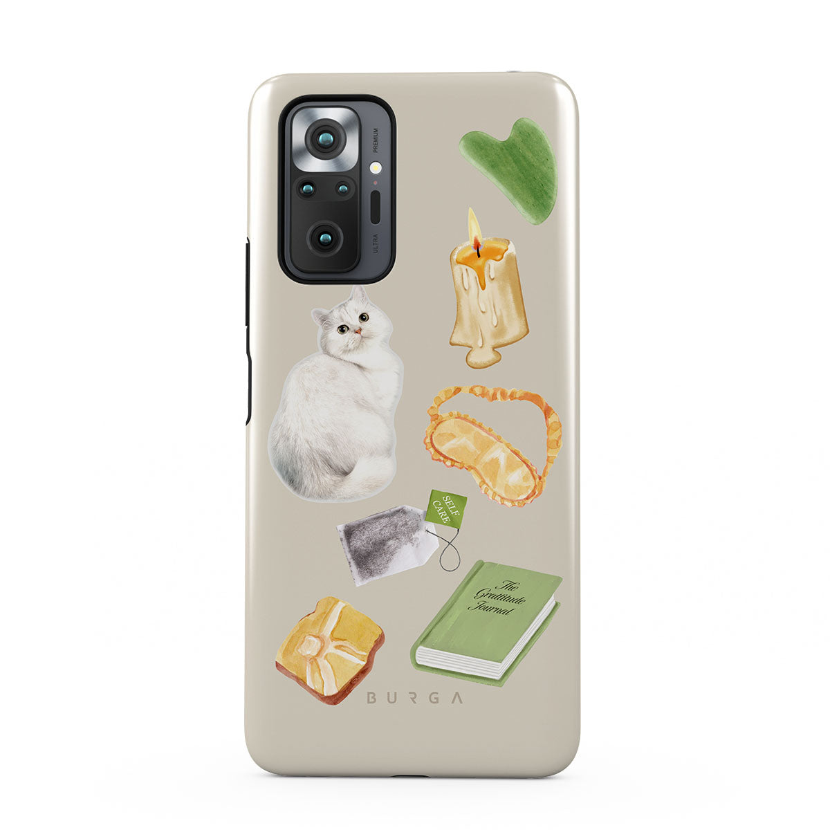 This design features: white cat, green book, candle, Gua Sha bar, sleeping mask, tea bag, yellow crystal