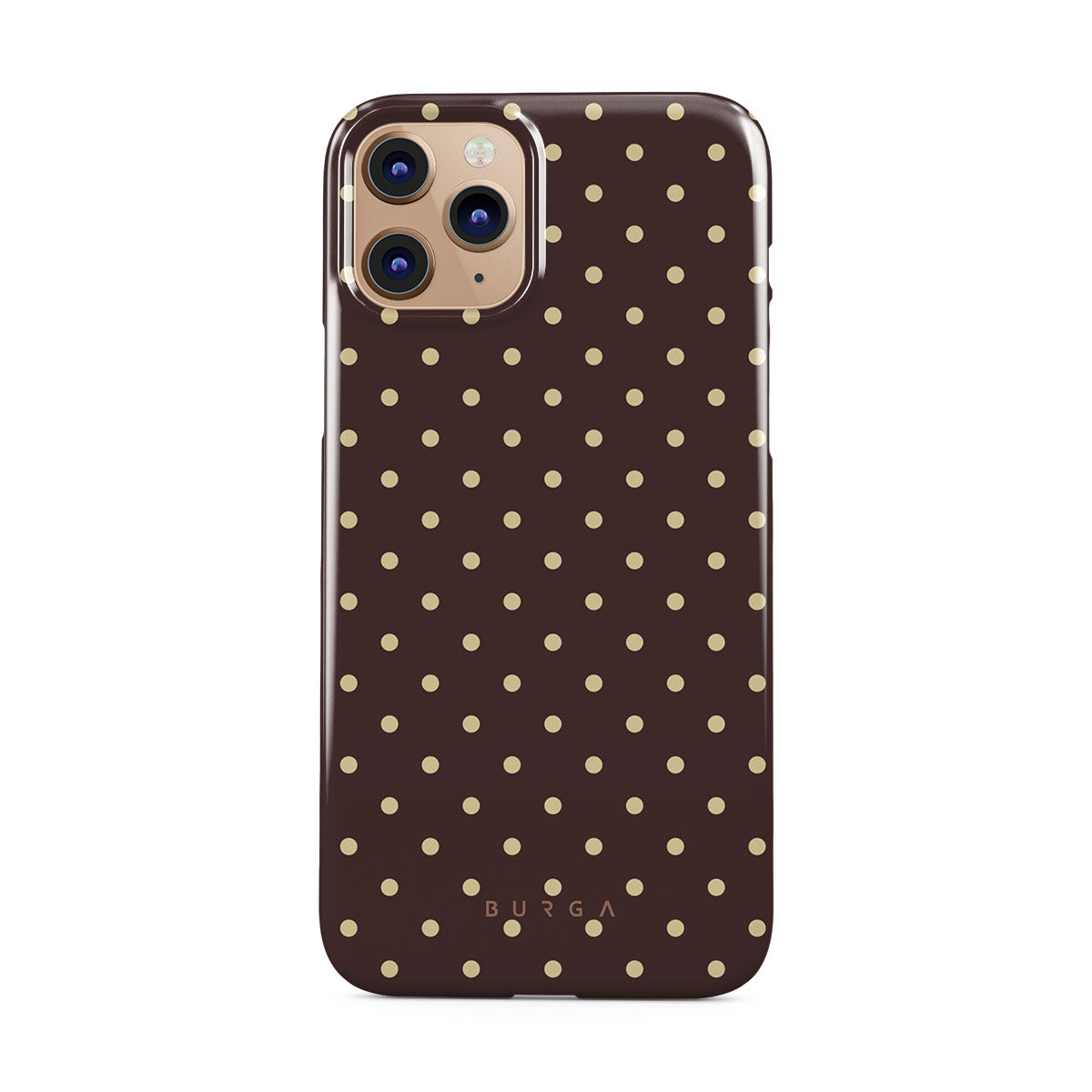 Playful yet polished, our Sorry Busy iPhone 11 Pro phone case design features a warm brown background sprinkled with delicate beige polka dots, blending charm with a professional edge. It's for those who keep it stylish, even when fully booked and thriving.