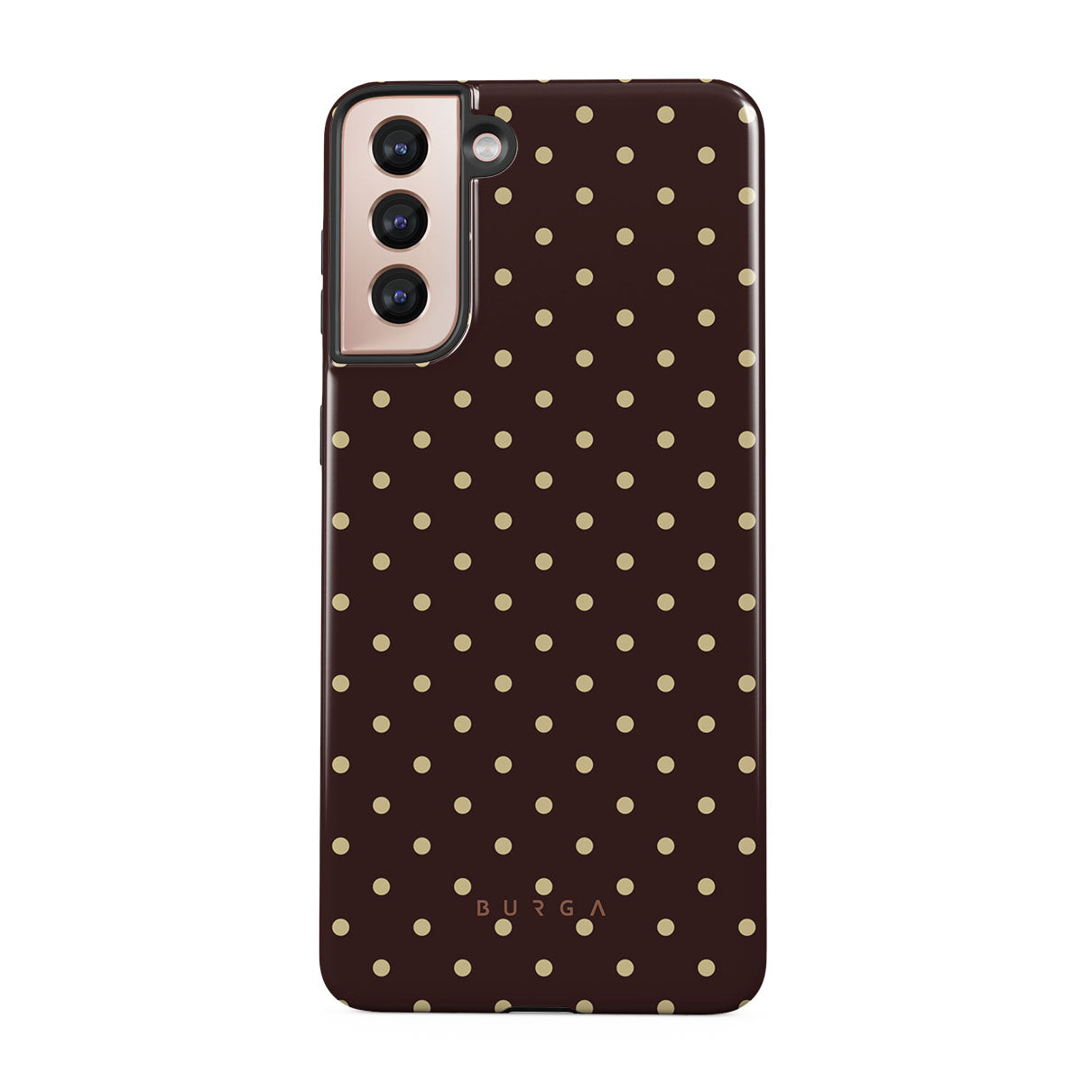 Playful yet polished, our Sorry Busy Samsung Galaxy S21 Plus phone case design features a warm brown background sprinkled with delicate beige polka dots, blending charm with a professional edge. It's for those who keep it stylish, even when fully booked and thriving.