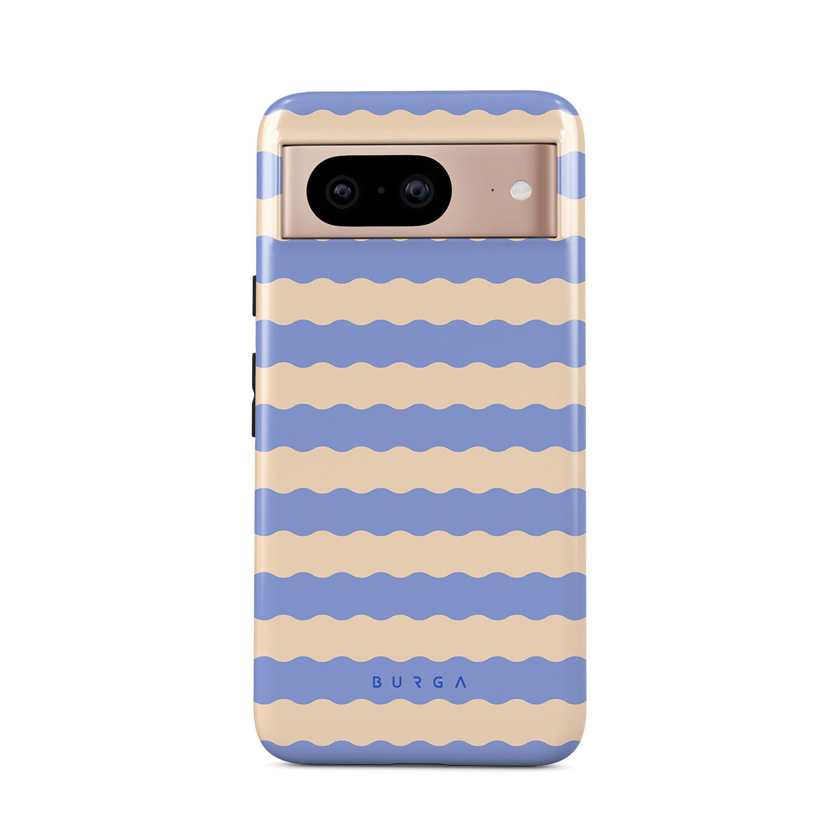 Dive into the cool, refreshing style of our Splash design–a dynamic Google Pixel 8 phone case featuring playful, wavy stripes of serene ocean blue and soft sandy beige. Perfect for those who love to make a splash with their accessories.