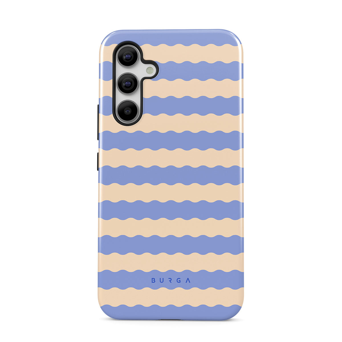 Dive into the cool, refreshing style of our Splash design–a dynamic Samsung Galaxy A55 phone case featuring playful, wavy stripes of serene ocean blue and soft sandy beige. Perfect for those who love to make a splash with their accessories.