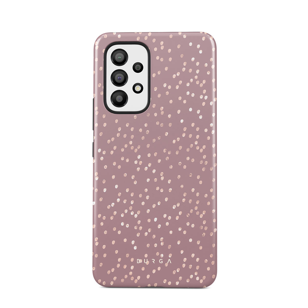 Trendy mauve color as a background for the gold-colored spots creates true beauty. Make your Samsung Galaxy A53 stand out with our protective and pretty Hot Cocoa phone case. The spotted pattern adds a touch of luxury to your phone, while the case's hard-shell nature offers much-needed protection.