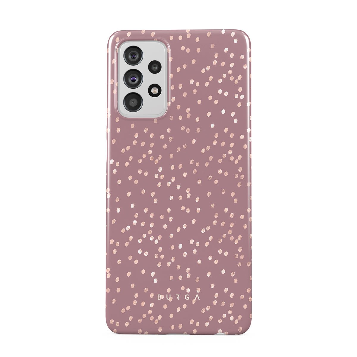 Trendy mauve color as a background for the gold-colored spots creates true beauty. Make your Samsung Galaxy A72 stand out with our protective and pretty Hot Cocoa phone case. The spotted pattern adds a touch of luxury to your phone, while the case's hard-shell nature offers much-needed protection.