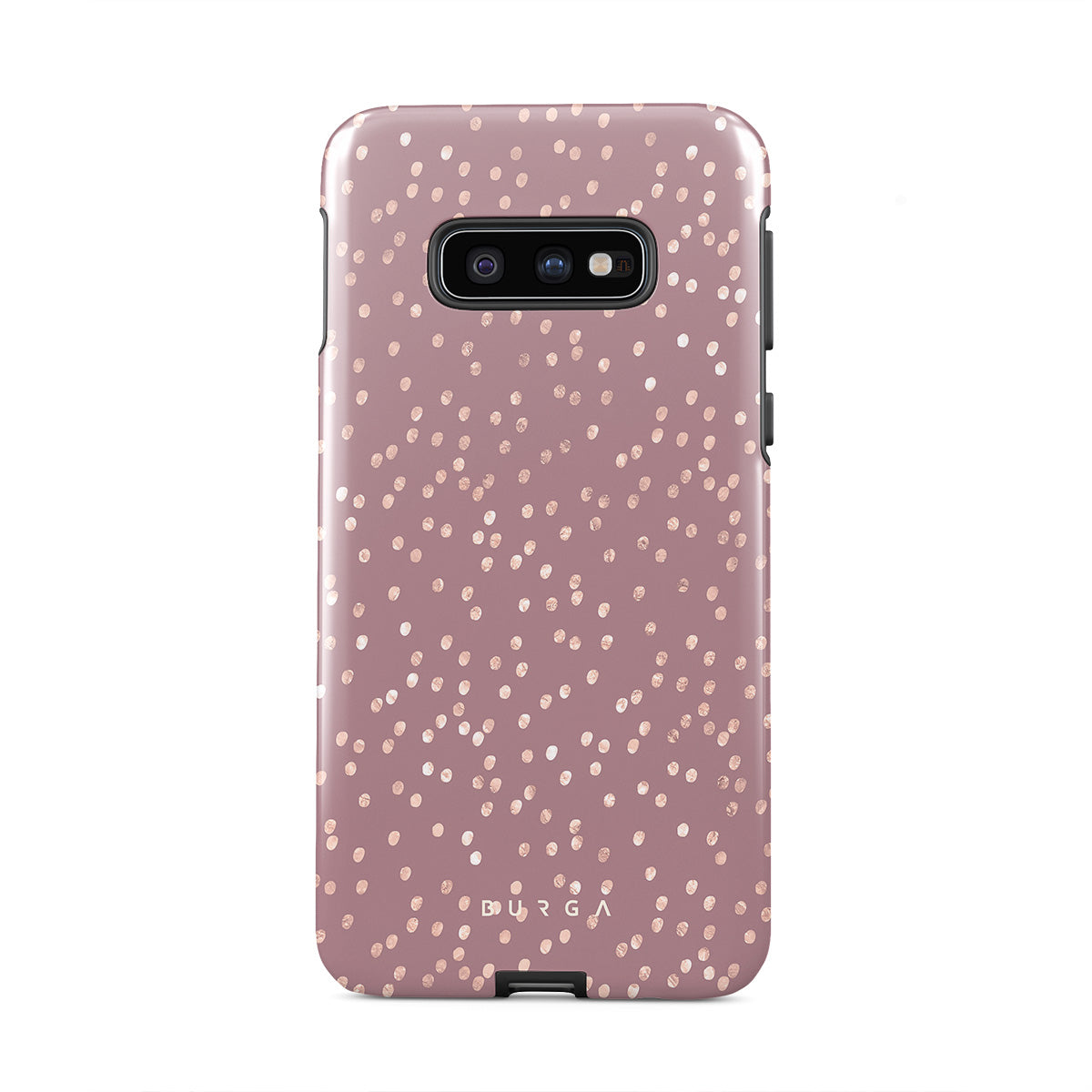 Trendy mauve color as a background for the gold-colored spots creates true beauty. Make your Samsung Galaxy S10E stand out with our protective and pretty Hot Cocoa phone case. The spotted pattern adds a touch of luxury to your phone, while the case's hard-shell nature offers much-needed protection.