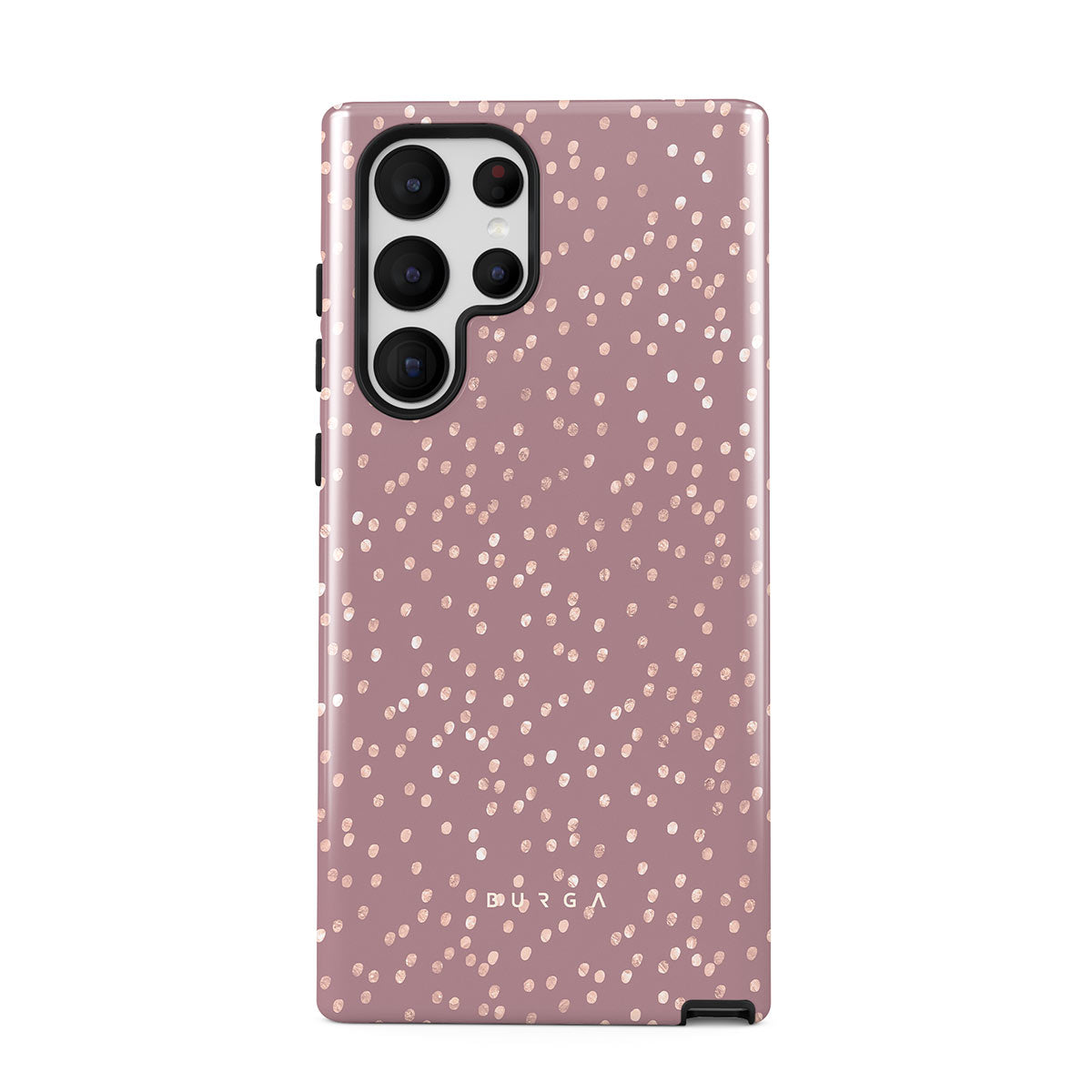 Trendy mauve color as a background for the gold-colored spots creates true beauty. Make your Samsung Galaxy S22 Ultra stand out with our protective and pretty Hot Cocoa phone case. The spotted pattern adds a touch of luxury to your phone, while the case's hard-shell nature offers much-needed protection.