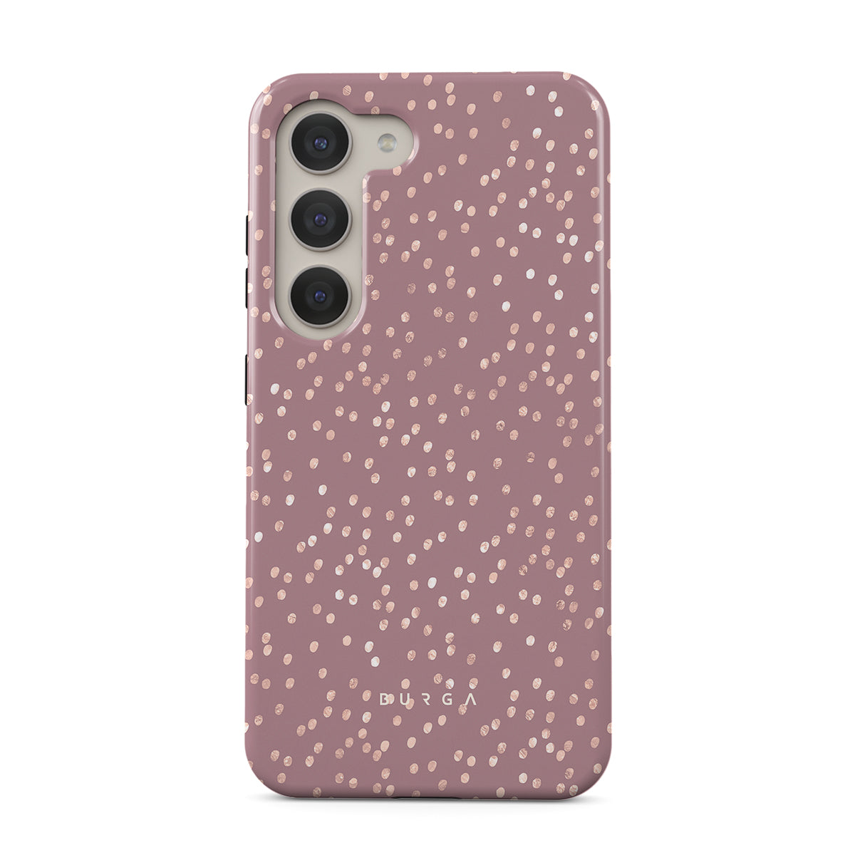 Trendy mauve color as a background for the gold-colored spots creates true beauty. Make your Samsung Galaxy S23 stand out with our protective and pretty Hot Cocoa phone case. The spotted pattern adds a touch of luxury to your phone, while the case's hard-shell nature offers much-needed protection.