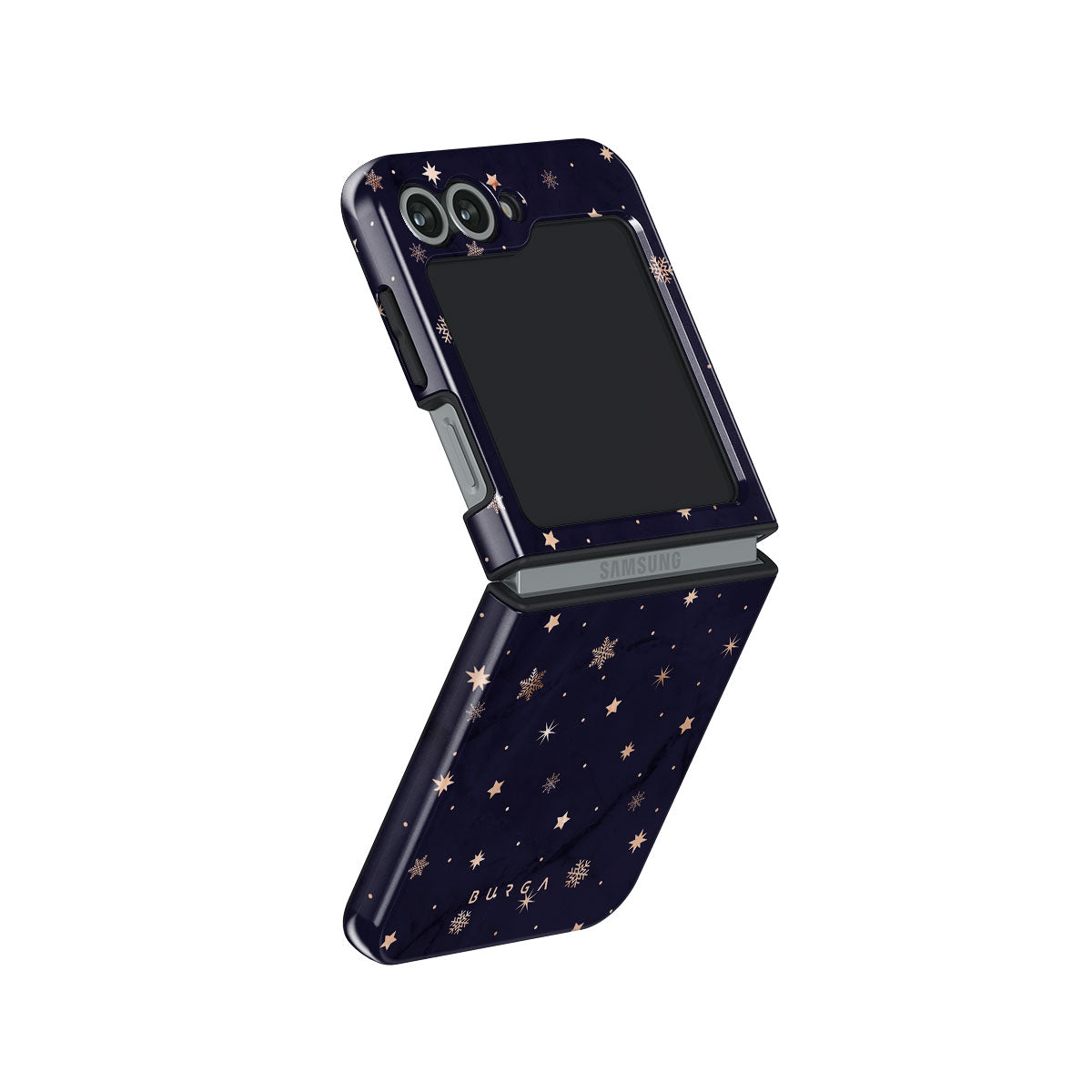 With a dreamy combination of dark blue and golden colors in the pretty star pattern found in our Midnight Kiss Samsung Galaxy Z Flip 6 phone case, you can protect your phone and add a magical feel to it just in one go.