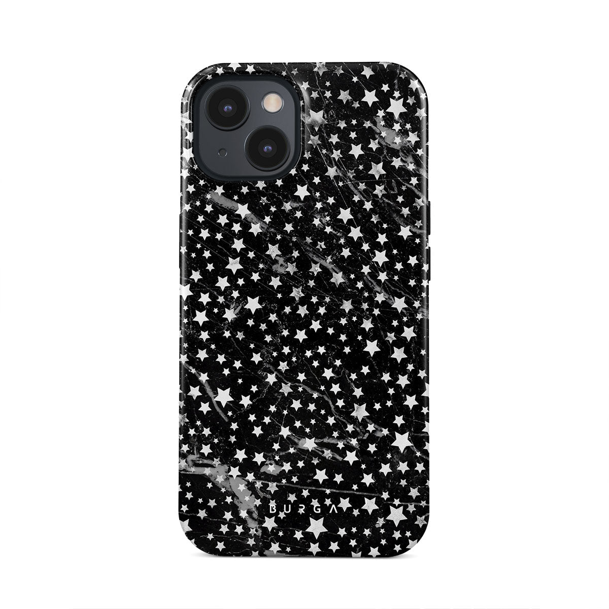 iPhone 15 phone case is inspired by the sky above us. Here the charming star pattern meets with a trendy black and white marble. Add the unique combination to your wardrobe and transform your protective phone case into a fashion accessory.