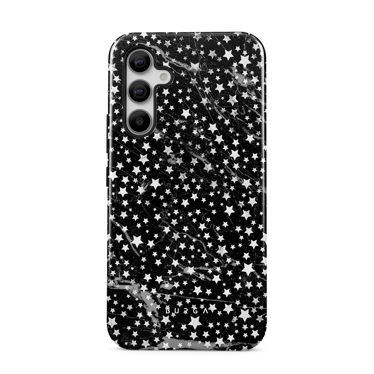 Samsung Galaxy A55 phone case is inspired by the sky above us. Here the charming star pattern meets with a trendy black and white marble. Add the unique combination to your wardrobe and transform your protective phone case into a fashion accessory.